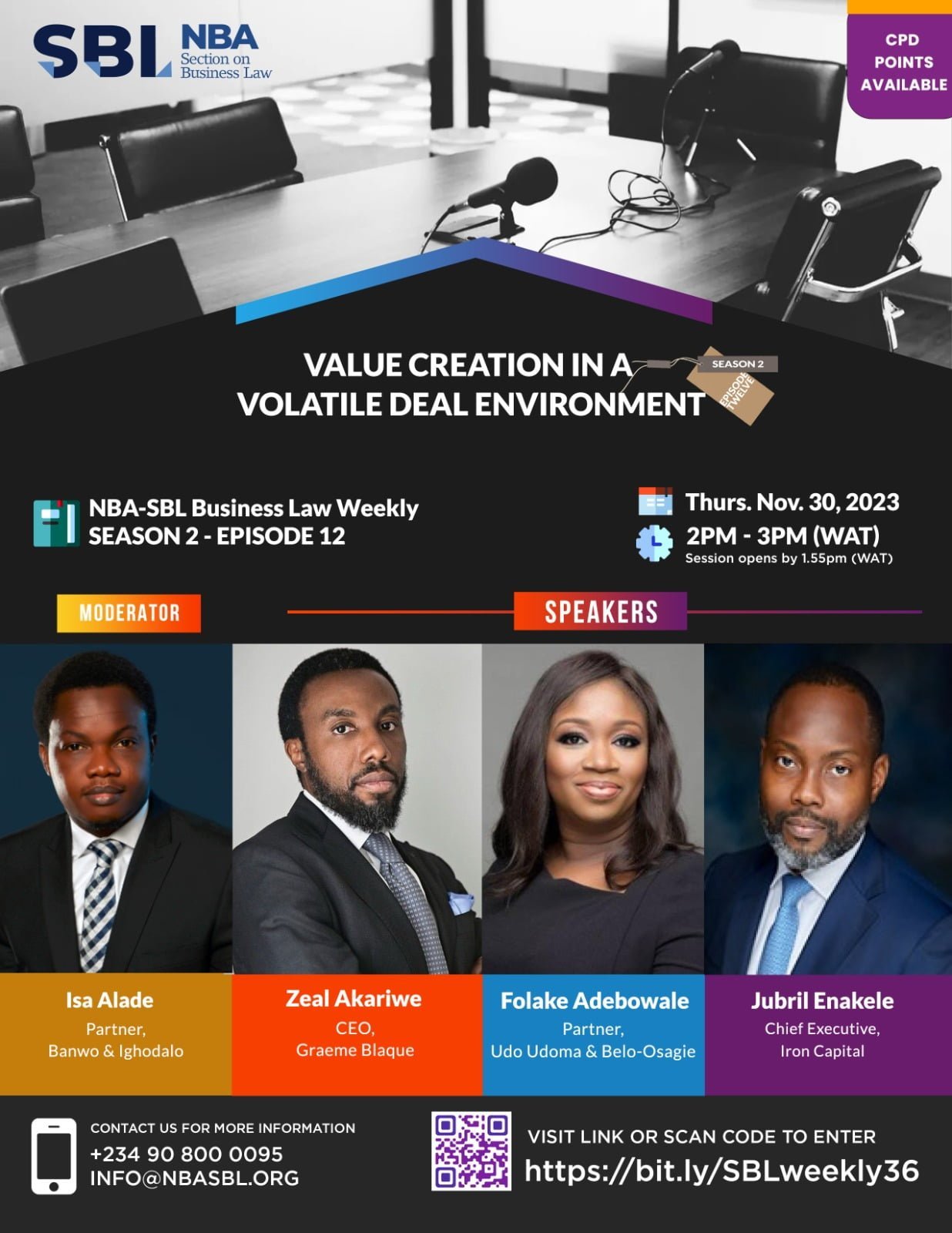 Business Law Weekly Season 2, episode 12 is here! Our Mergers, Acquisition and Corporate Reorganisation Committee will be hosting this session as follows: ----- πŸ”–VALUE CREATION IN A VOLATILE DEAL ENVIRONMENT πŸ—“οΈ Thurs. Nov. 30, 2023 πŸ•‘ 2PM (WAT) πŸ”— https://bit.ly/SBLweekly36 To download previous editions of Season 1, please visit our website on main.nbasbl.org/resource Do […]